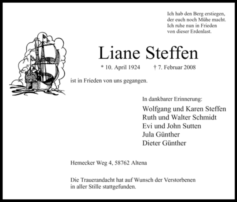 Hier finden Sie alle Traueranzeigen aus der Zeitung, die bisher für Liane Steffen erschienen sind. Weitere Traueranzeigen, die in der Zeitung erscheinen, werden hier ebenfalls aufgelistet
