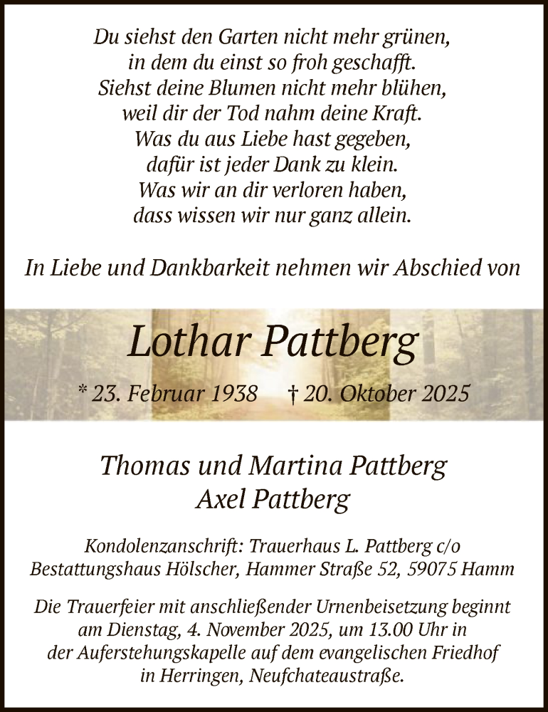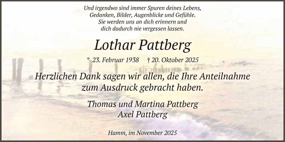 Hier finden Sie alle Traueranzeigen aus der Zeitung, die bisher für Lothar Pattberg erschienen sind. Weitere Traueranzeigen, die in der Zeitung erscheinen, werden hier ebenfalls aufgelistet