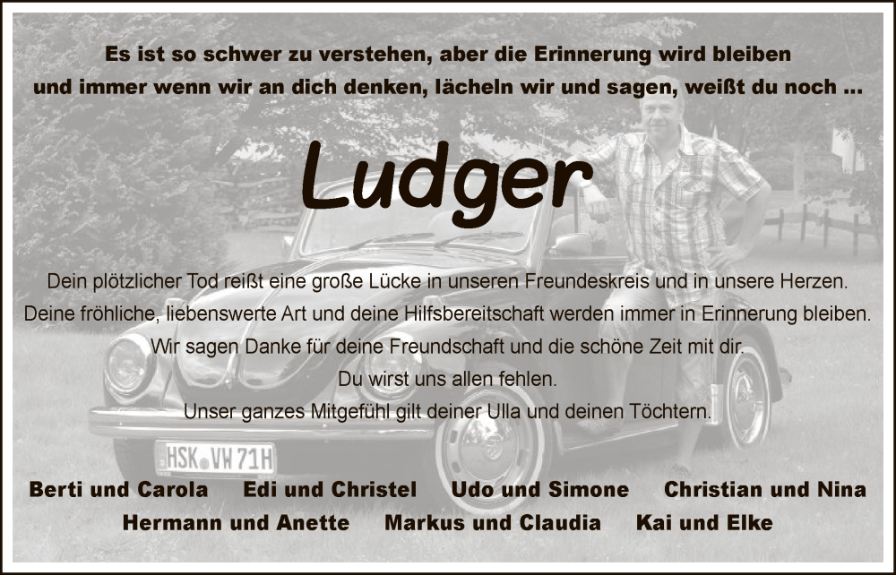 Hier finden Sie alle Traueranzeigen aus der Zeitung, die bisher für Ludger erschienen sind. Weitere Traueranzeigen, die in der Zeitung erscheinen, werden hier ebenfalls aufgelistet