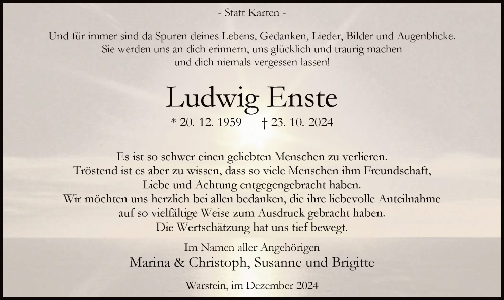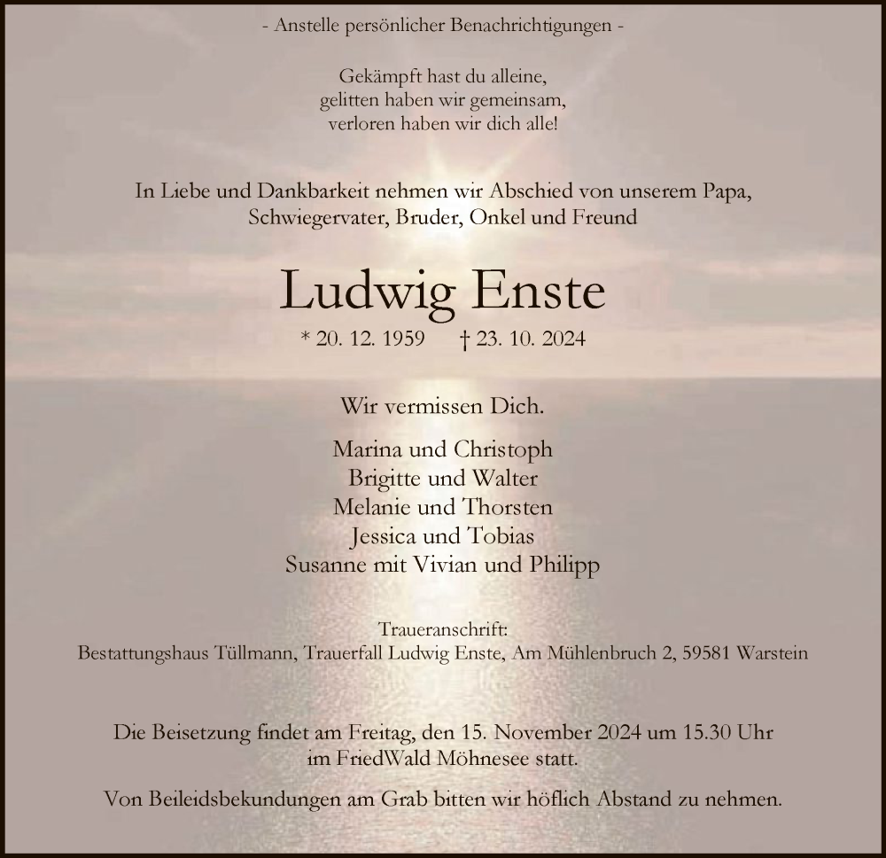 Hier finden Sie alle Traueranzeigen aus der Zeitung, die bisher für Ludwig Enste erschienen sind. Weitere Traueranzeigen, die in der Zeitung erscheinen, werden hier ebenfalls aufgelistet