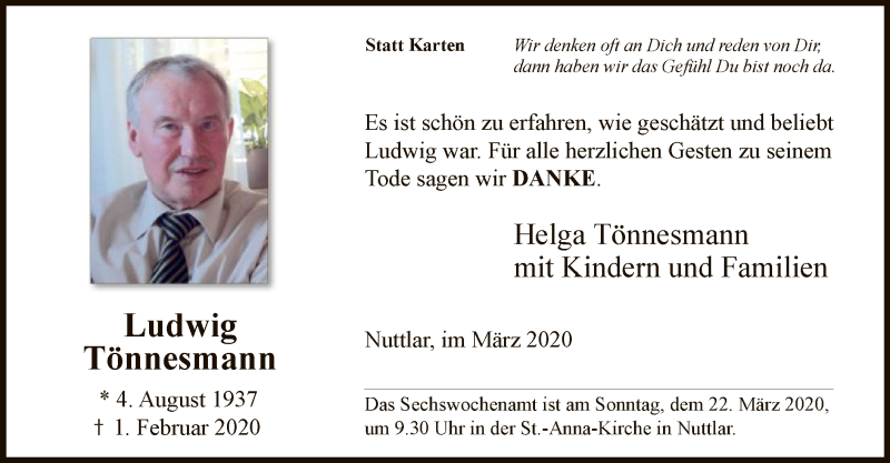 Hier finden Sie alle Traueranzeigen aus der Zeitung, die bisher für Ludwig Tönnesmann erschienen sind. Weitere Traueranzeigen, die in der Zeitung erscheinen, werden hier ebenfalls aufgelistet