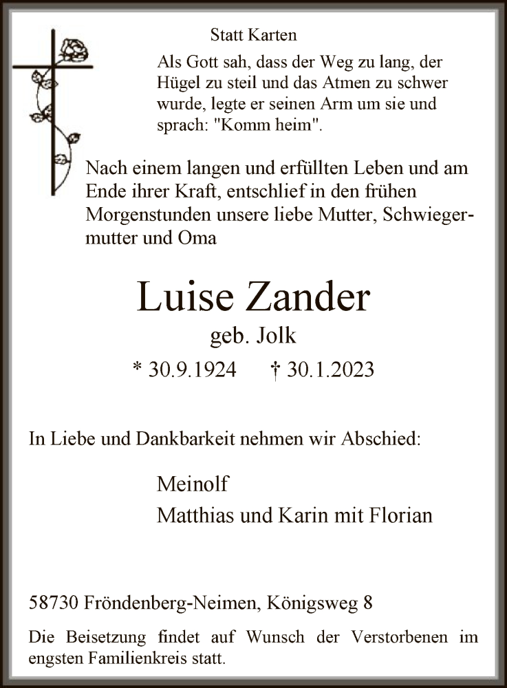 Hier finden Sie alle Traueranzeigen aus der Zeitung, die bisher für Luise Zander erschienen sind. Weitere Traueranzeigen, die in der Zeitung erscheinen, werden hier ebenfalls aufgelistet