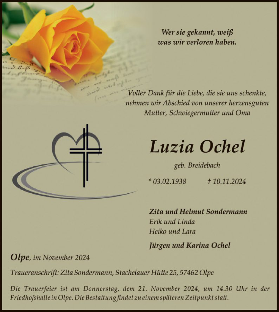 Hier finden Sie alle Traueranzeigen aus der Zeitung, die bisher für Luzia Ochel erschienen sind. Weitere Traueranzeigen, die in der Zeitung erscheinen, werden hier ebenfalls aufgelistet