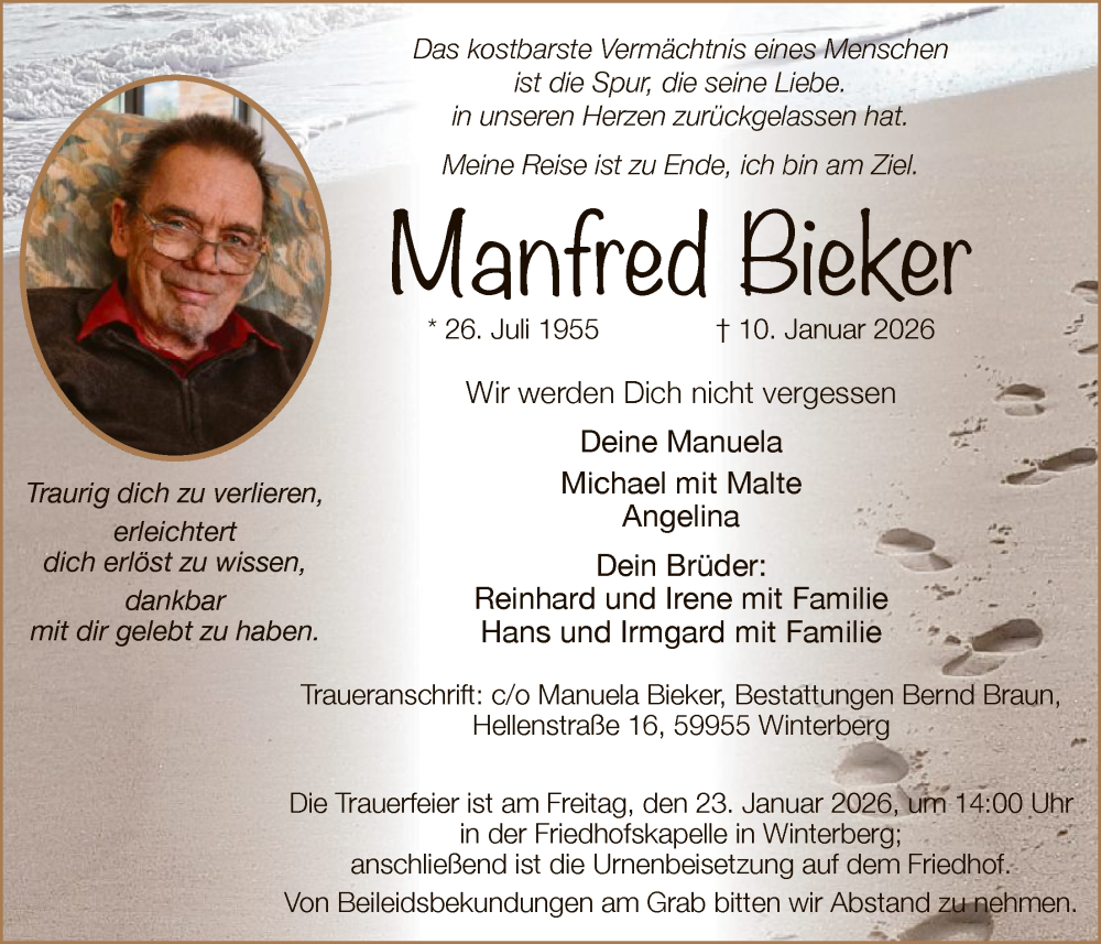 Hier finden Sie alle Traueranzeigen aus der Zeitung, die bisher für Manfred Bieker erschienen sind. Weitere Traueranzeigen, die in der Zeitung erscheinen, werden hier ebenfalls aufgelistet