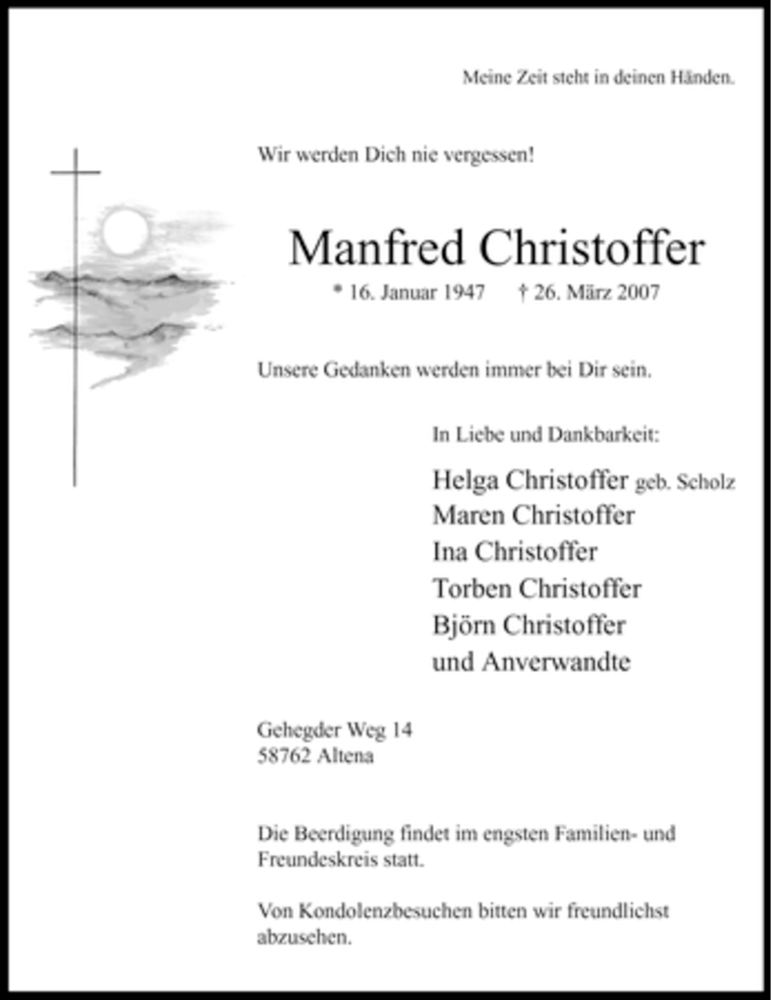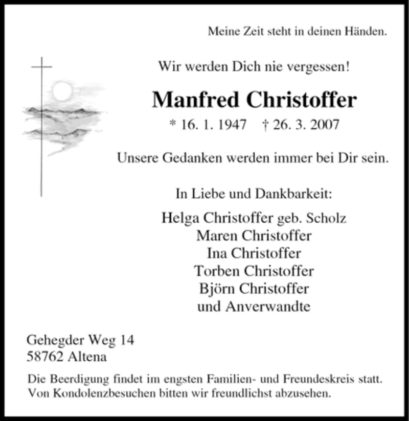 Hier finden Sie alle Traueranzeigen aus der Zeitung, die bisher für Manfred Christoffer erschienen sind. Weitere Traueranzeigen, die in der Zeitung erscheinen, werden hier ebenfalls aufgelistet