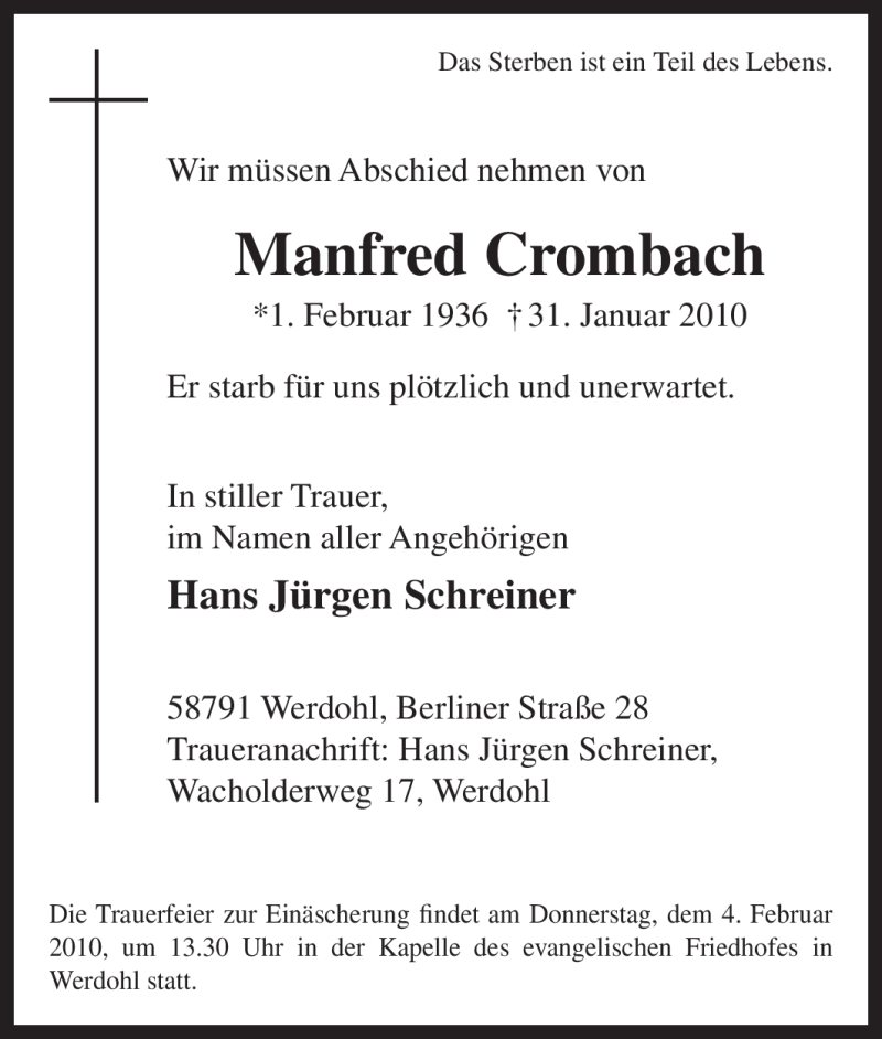 Hier finden Sie alle Traueranzeigen aus der Zeitung, die bisher für Manfred Crombach erschienen sind. Weitere Traueranzeigen, die in der Zeitung erscheinen, werden hier ebenfalls aufgelistet