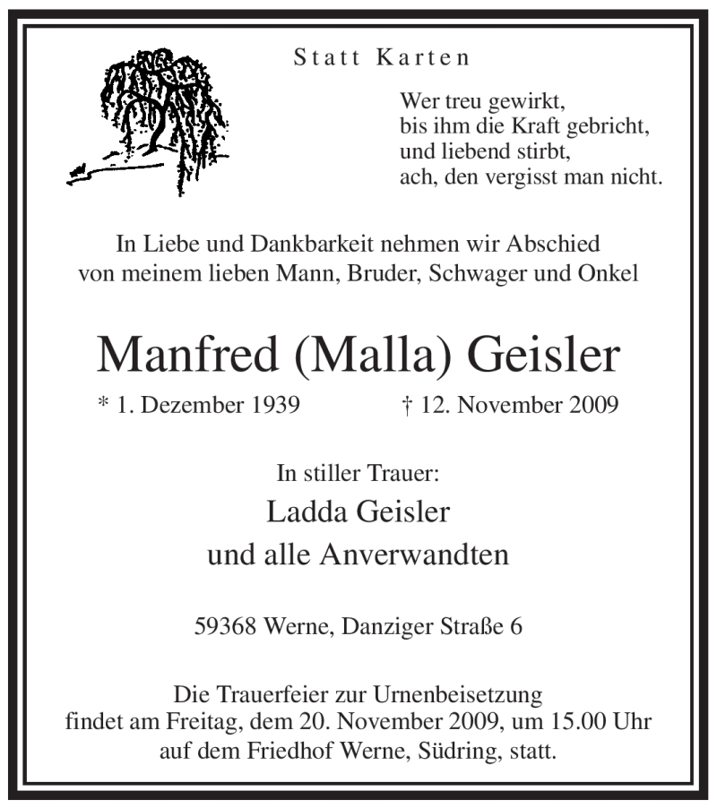Hier finden Sie alle Traueranzeigen aus der Zeitung, die bisher für Manfred Geisler erschienen sind. Weitere Traueranzeigen, die in der Zeitung erscheinen, werden hier ebenfalls aufgelistet