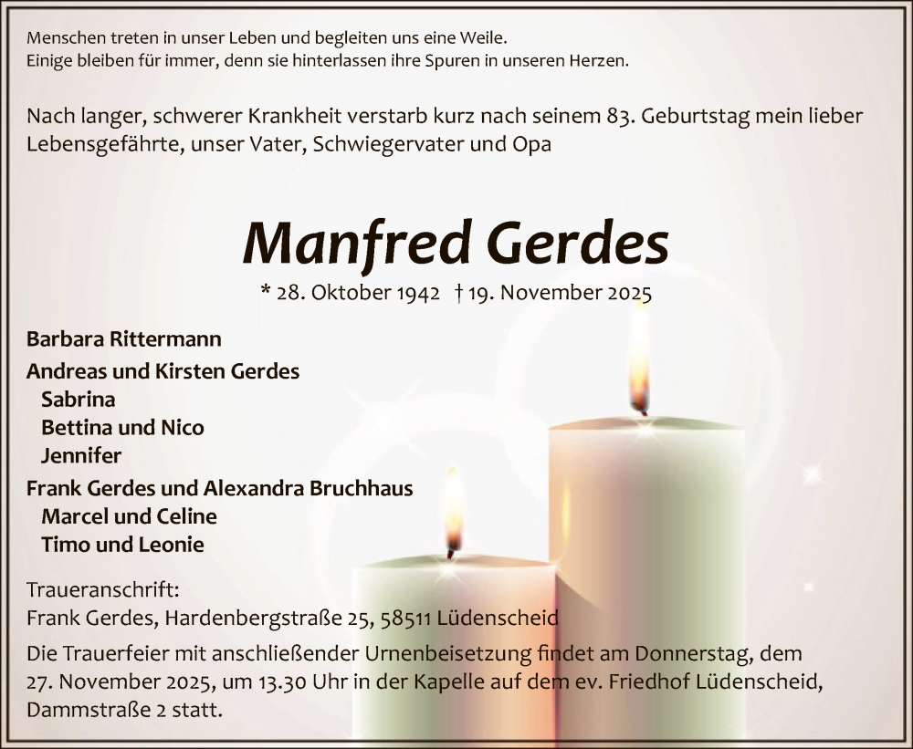 Hier finden Sie alle Traueranzeigen aus der Zeitung, die bisher für Manfred Gerdes erschienen sind. Weitere Traueranzeigen, die in der Zeitung erscheinen, werden hier ebenfalls aufgelistet