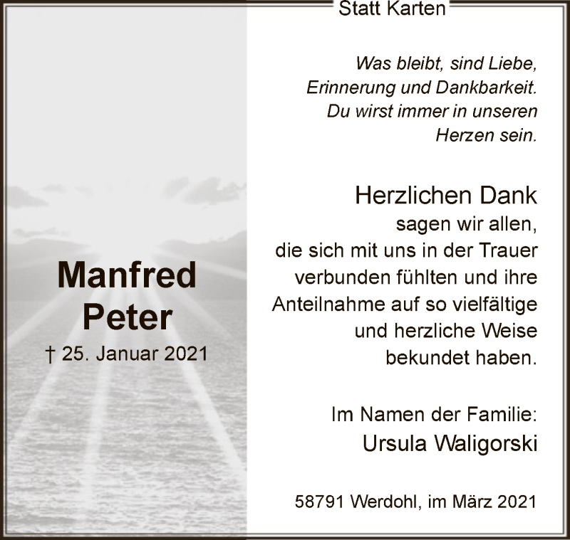 Hier finden Sie alle Traueranzeigen aus der Zeitung, die bisher für Manfred Peter erschienen sind. Weitere Traueranzeigen, die in der Zeitung erscheinen, werden hier ebenfalls aufgelistet
