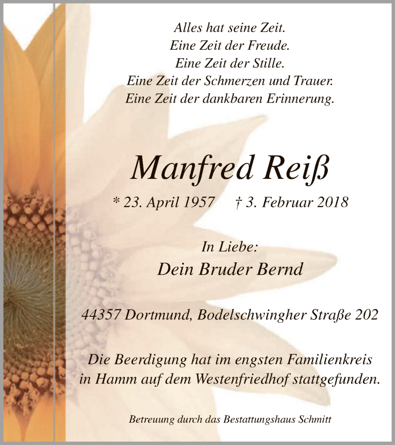 Hier finden Sie alle Traueranzeigen aus der Zeitung, die bisher für Manfred Reiß erschienen sind. Weitere Traueranzeigen, die in der Zeitung erscheinen, werden hier ebenfalls aufgelistet