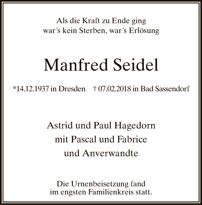 Hier finden Sie alle Traueranzeigen aus der Zeitung, die bisher für Manfred Seidel erschienen sind. Weitere Traueranzeigen, die in der Zeitung erscheinen, werden hier ebenfalls aufgelistet