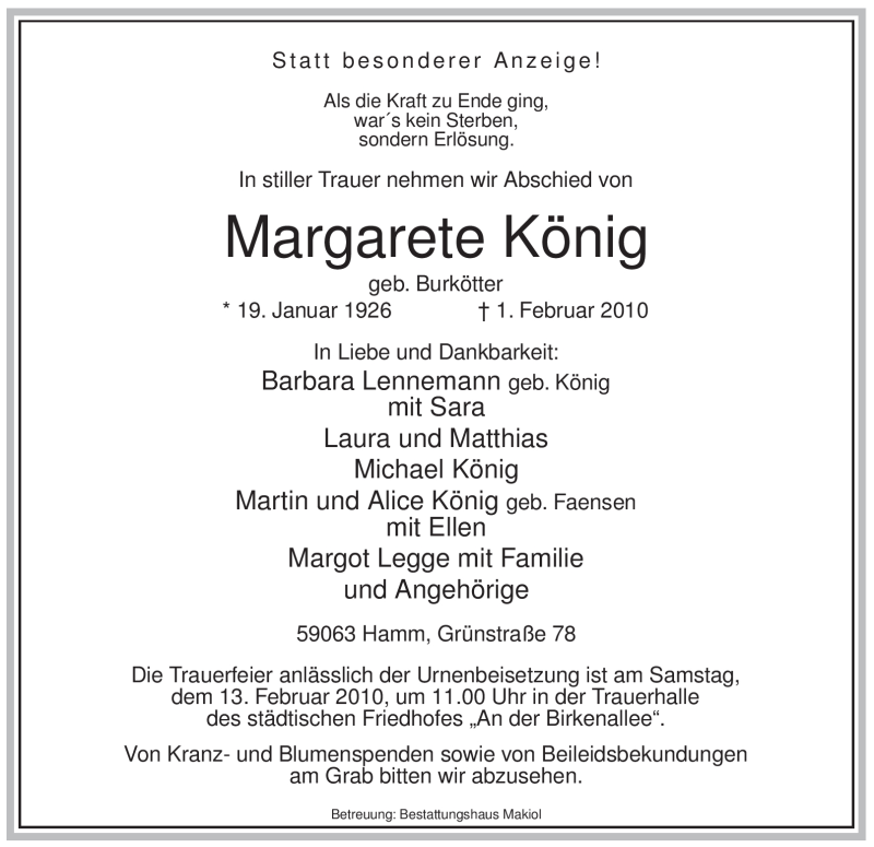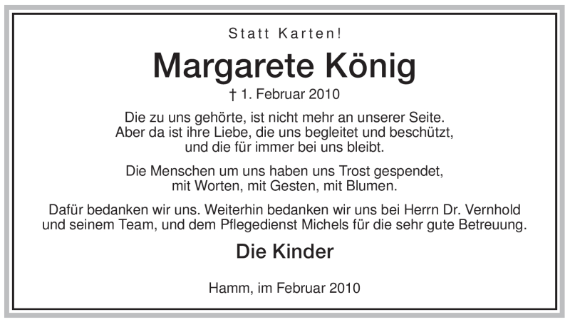 Hier finden Sie alle Traueranzeigen aus der Zeitung, die bisher für Margarete König erschienen sind. Weitere Traueranzeigen, die in der Zeitung erscheinen, werden hier ebenfalls aufgelistet