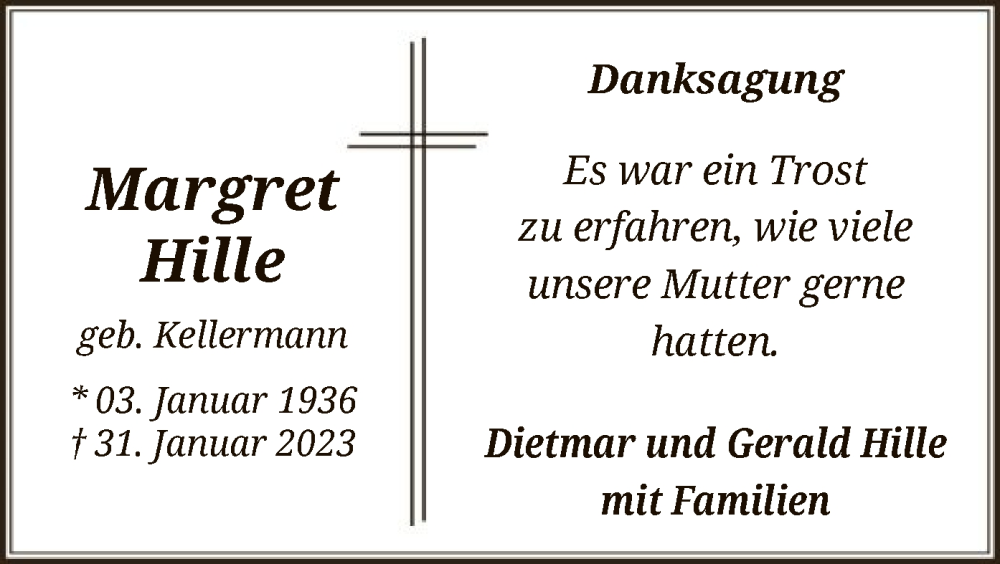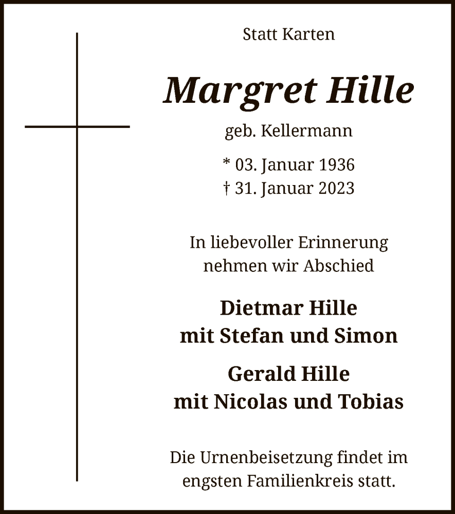 Hier finden Sie alle Traueranzeigen aus der Zeitung, die bisher für Margret Hille erschienen sind. Weitere Traueranzeigen, die in der Zeitung erscheinen, werden hier ebenfalls aufgelistet