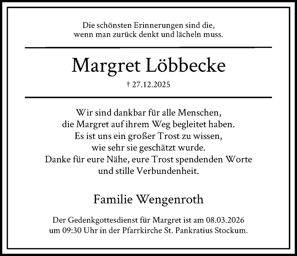Hier finden Sie alle Traueranzeigen aus der Zeitung, die bisher für Margret Löbbecke erschienen sind. Weitere Traueranzeigen, die in der Zeitung erscheinen, werden hier ebenfalls aufgelistet