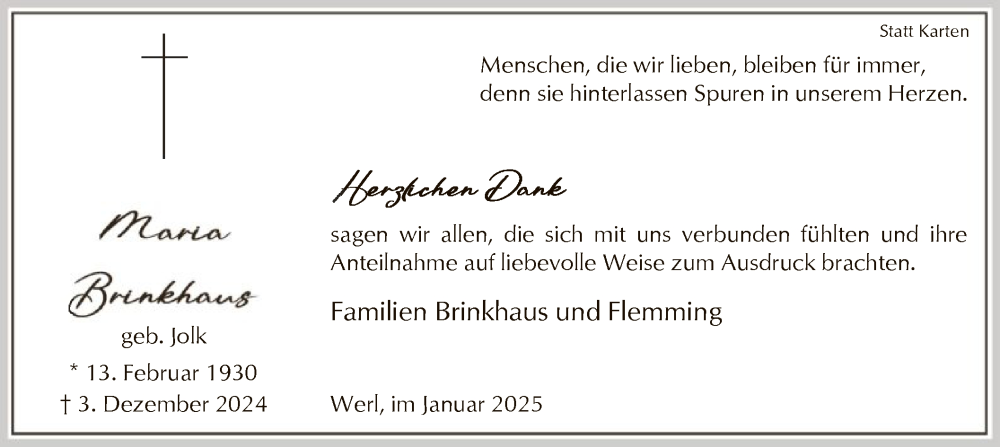 Hier finden Sie alle Traueranzeigen aus der Zeitung, die bisher für Maria Brinkhaus erschienen sind. Weitere Traueranzeigen, die in der Zeitung erscheinen, werden hier ebenfalls aufgelistet