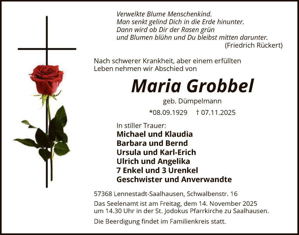 Hier finden Sie alle Traueranzeigen aus der Zeitung, die bisher für Maria Grobbel erschienen sind. Weitere Traueranzeigen, die in der Zeitung erscheinen, werden hier ebenfalls aufgelistet