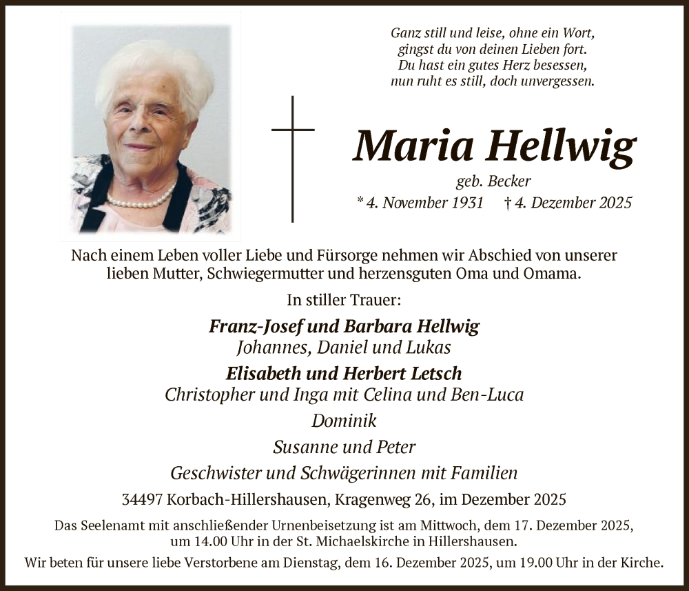 Hier finden Sie alle Traueranzeigen aus der Zeitung, die bisher für Maria Hellwig erschienen sind. Weitere Traueranzeigen, die in der Zeitung erscheinen, werden hier ebenfalls aufgelistet