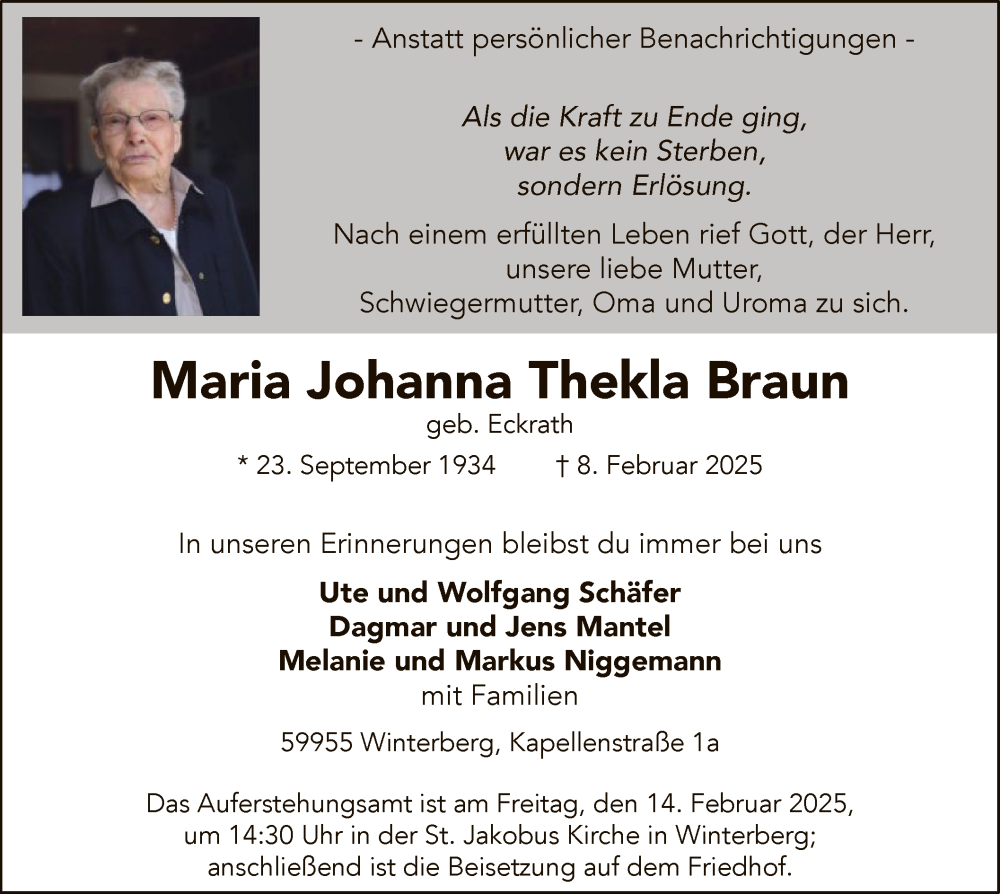 Hier finden Sie alle Traueranzeigen aus der Zeitung, die bisher für Maria Johanna Thekla Braun erschienen sind. Weitere Traueranzeigen, die in der Zeitung erscheinen, werden hier ebenfalls aufgelistet