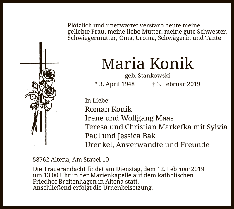 Hier finden Sie alle Traueranzeigen aus der Zeitung, die bisher für Maria Konik erschienen sind. Weitere Traueranzeigen, die in der Zeitung erscheinen, werden hier ebenfalls aufgelistet
