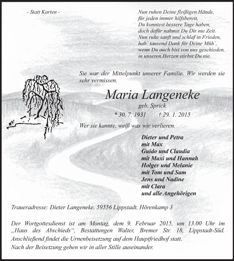 Hier finden Sie alle Traueranzeigen aus der Zeitung, die bisher für Maria Langeneke erschienen sind. Weitere Traueranzeigen, die in der Zeitung erscheinen, werden hier ebenfalls aufgelistet
