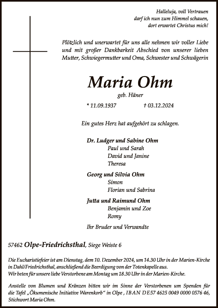 Hier finden Sie alle Traueranzeigen aus der Zeitung, die bisher für Maria Ohm erschienen sind. Weitere Traueranzeigen, die in der Zeitung erscheinen, werden hier ebenfalls aufgelistet
