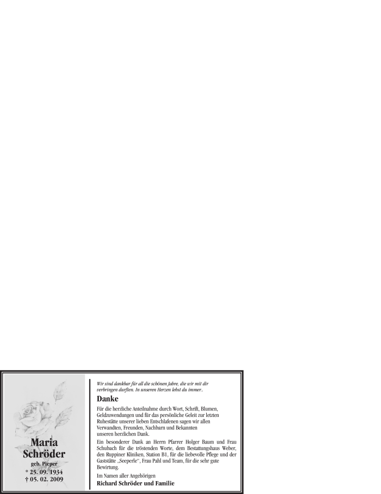 Hier finden Sie alle Traueranzeigen aus der Zeitung, die bisher für Maria Schröder erschienen sind. Weitere Traueranzeigen, die in der Zeitung erscheinen, werden hier ebenfalls aufgelistet