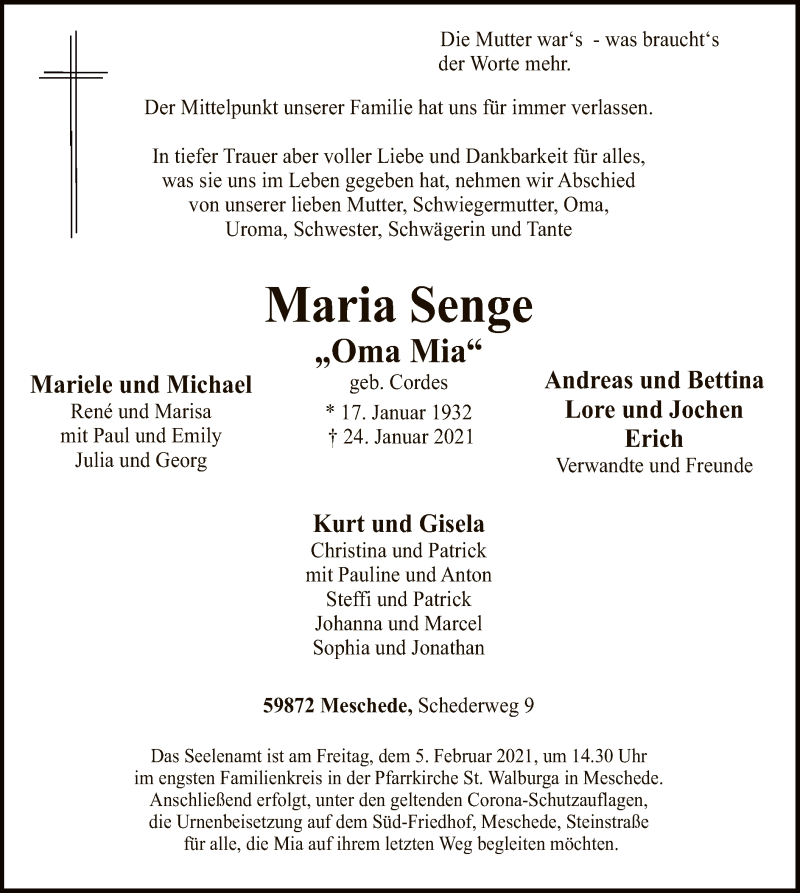 Hier finden Sie alle Traueranzeigen aus der Zeitung, die bisher für Maria Senge erschienen sind. Weitere Traueranzeigen, die in der Zeitung erscheinen, werden hier ebenfalls aufgelistet