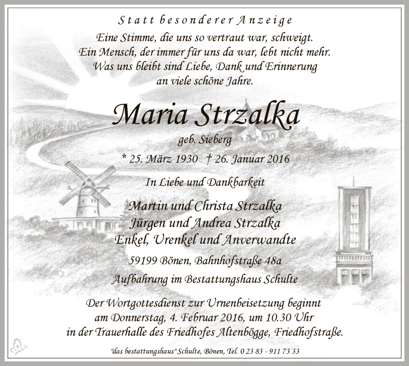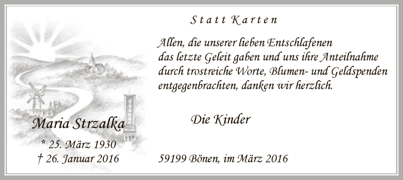 Hier finden Sie alle Traueranzeigen aus der Zeitung, die bisher für Maria Strzalka erschienen sind. Weitere Traueranzeigen, die in der Zeitung erscheinen, werden hier ebenfalls aufgelistet