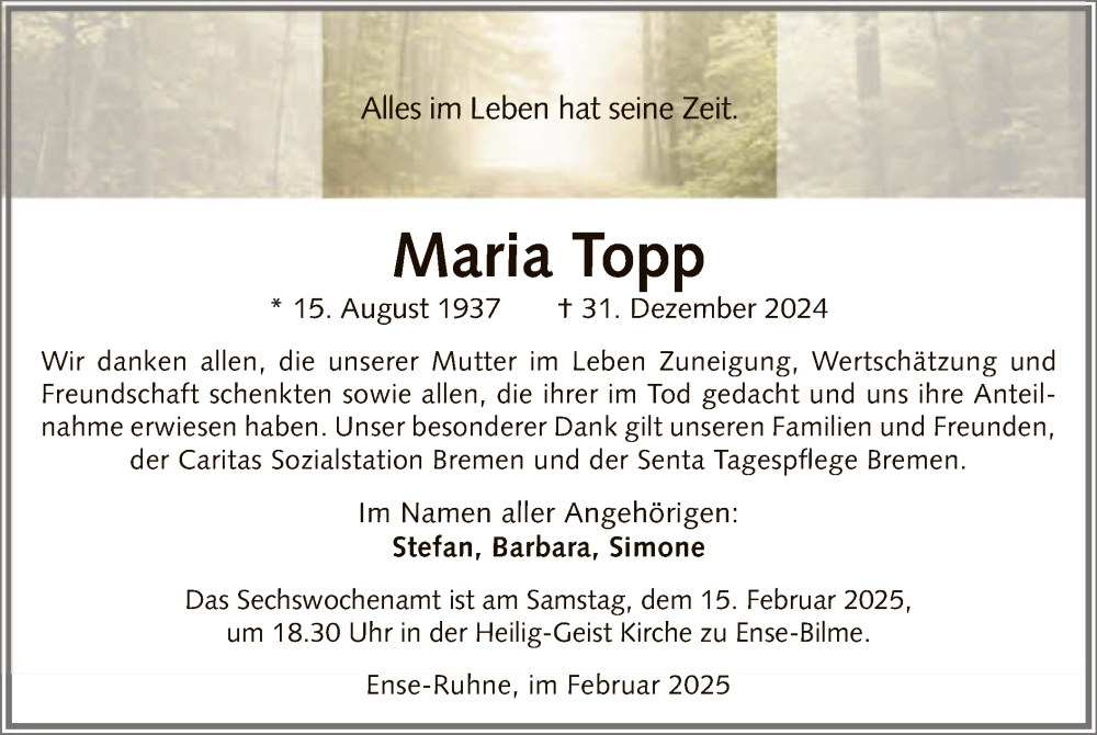 Hier finden Sie alle Traueranzeigen aus der Zeitung, die bisher für Maria Topp erschienen sind. Weitere Traueranzeigen, die in der Zeitung erscheinen, werden hier ebenfalls aufgelistet