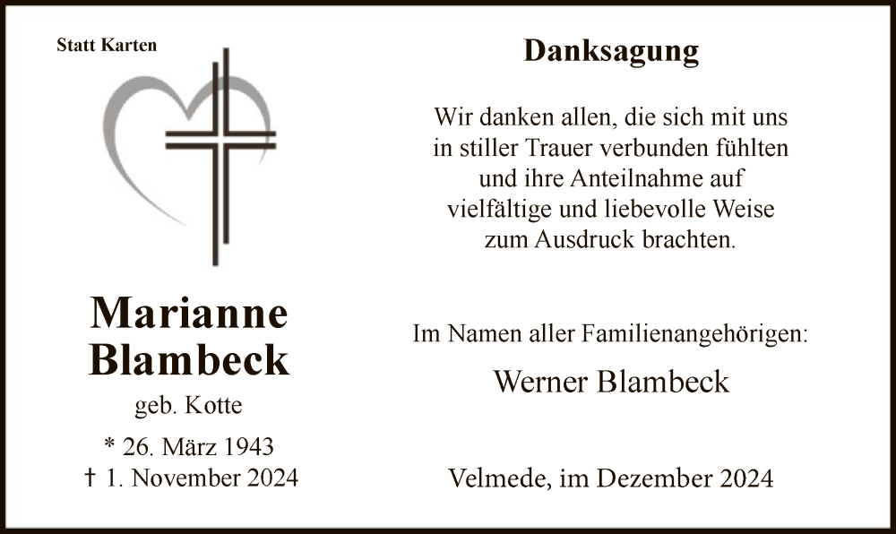 Hier finden Sie alle Traueranzeigen aus der Zeitung, die bisher für Marianne Blambeck erschienen sind. Weitere Traueranzeigen, die in der Zeitung erscheinen, werden hier ebenfalls aufgelistet