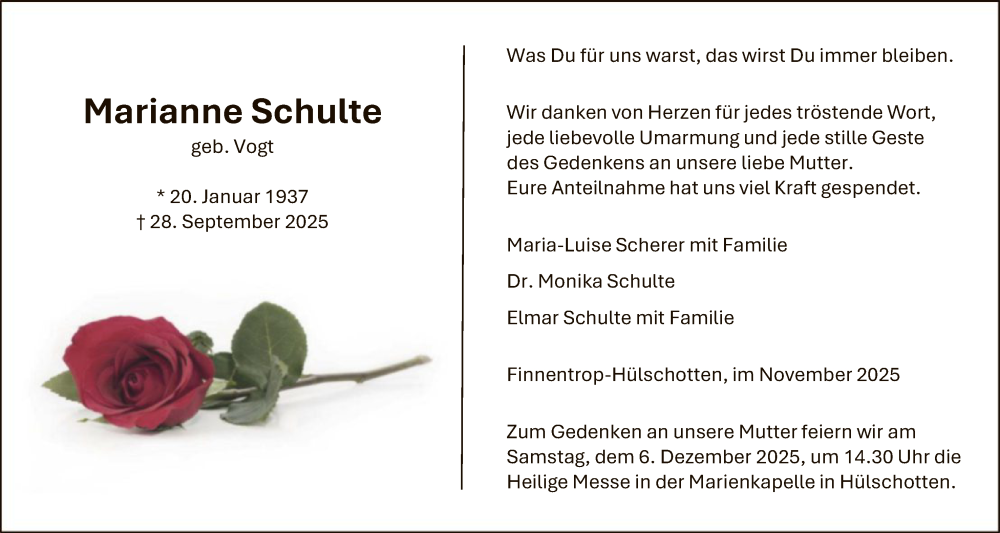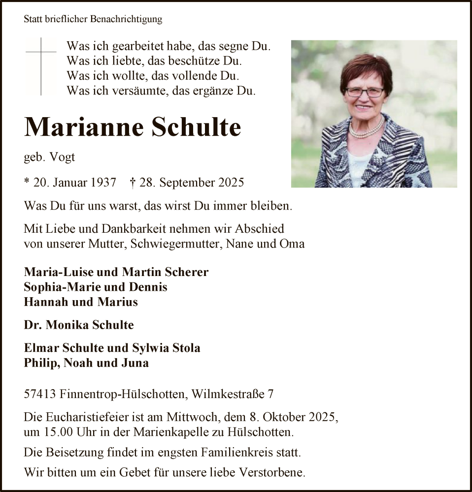 Hier finden Sie alle Traueranzeigen aus der Zeitung, die bisher für Marianne Schulte erschienen sind. Weitere Traueranzeigen, die in der Zeitung erscheinen, werden hier ebenfalls aufgelistet