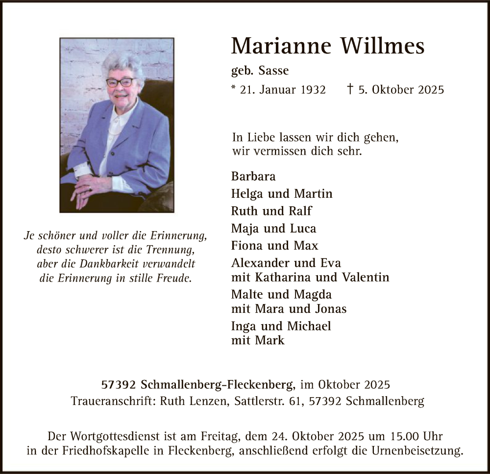 Hier finden Sie alle Traueranzeigen aus der Zeitung, die bisher für Marianne Willmes erschienen sind. Weitere Traueranzeigen, die in der Zeitung erscheinen, werden hier ebenfalls aufgelistet