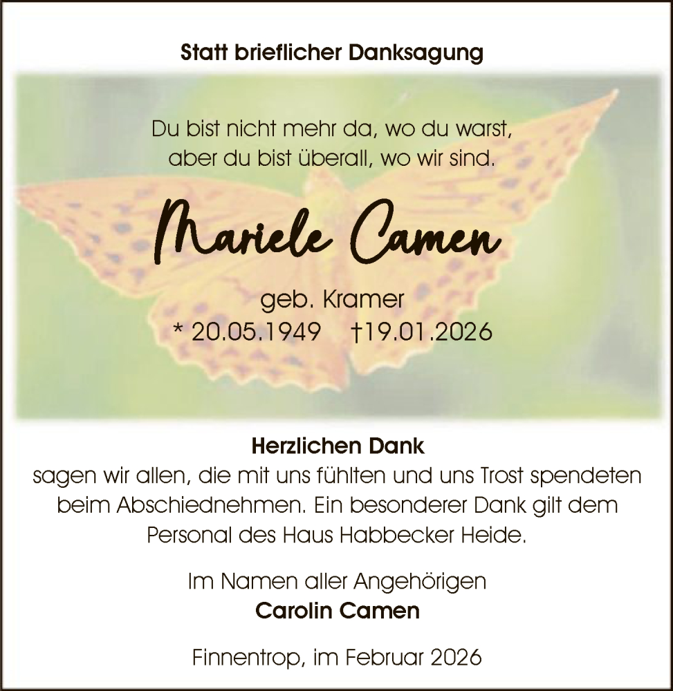 Hier finden Sie alle Traueranzeigen aus der Zeitung, die bisher für Mariele Camen erschienen sind. Weitere Traueranzeigen, die in der Zeitung erscheinen, werden hier ebenfalls aufgelistet
