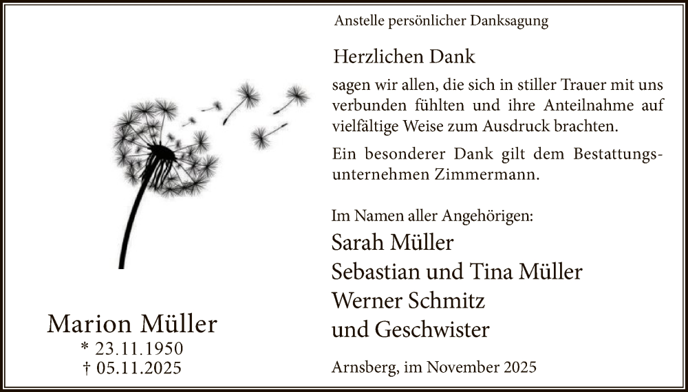 Hier finden Sie alle Traueranzeigen aus der Zeitung, die bisher für Marion Müller erschienen sind. Weitere Traueranzeigen, die in der Zeitung erscheinen, werden hier ebenfalls aufgelistet