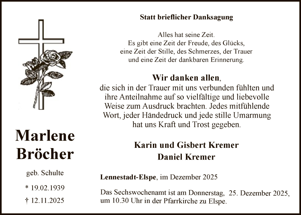 Hier finden Sie alle Traueranzeigen aus der Zeitung, die bisher für Marlene Bröcher erschienen sind. Weitere Traueranzeigen, die in der Zeitung erscheinen, werden hier ebenfalls aufgelistet
