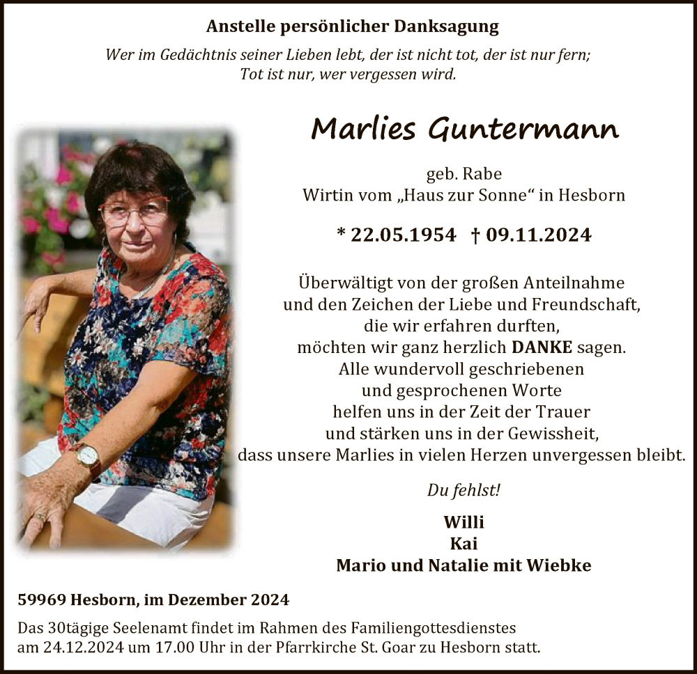 Hier finden Sie alle Traueranzeigen aus der Zeitung, die bisher für Marlies Guntermann erschienen sind. Weitere Traueranzeigen, die in der Zeitung erscheinen, werden hier ebenfalls aufgelistet