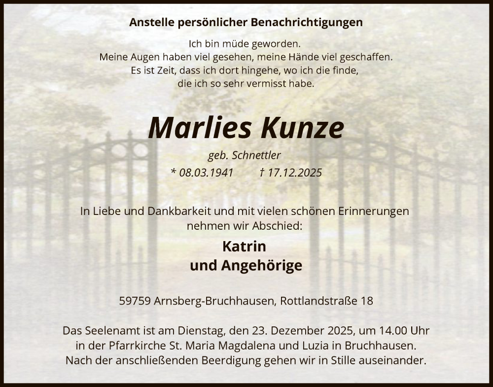 Hier finden Sie alle Traueranzeigen aus der Zeitung, die bisher für Marlies Kunze erschienen sind. Weitere Traueranzeigen, die in der Zeitung erscheinen, werden hier ebenfalls aufgelistet