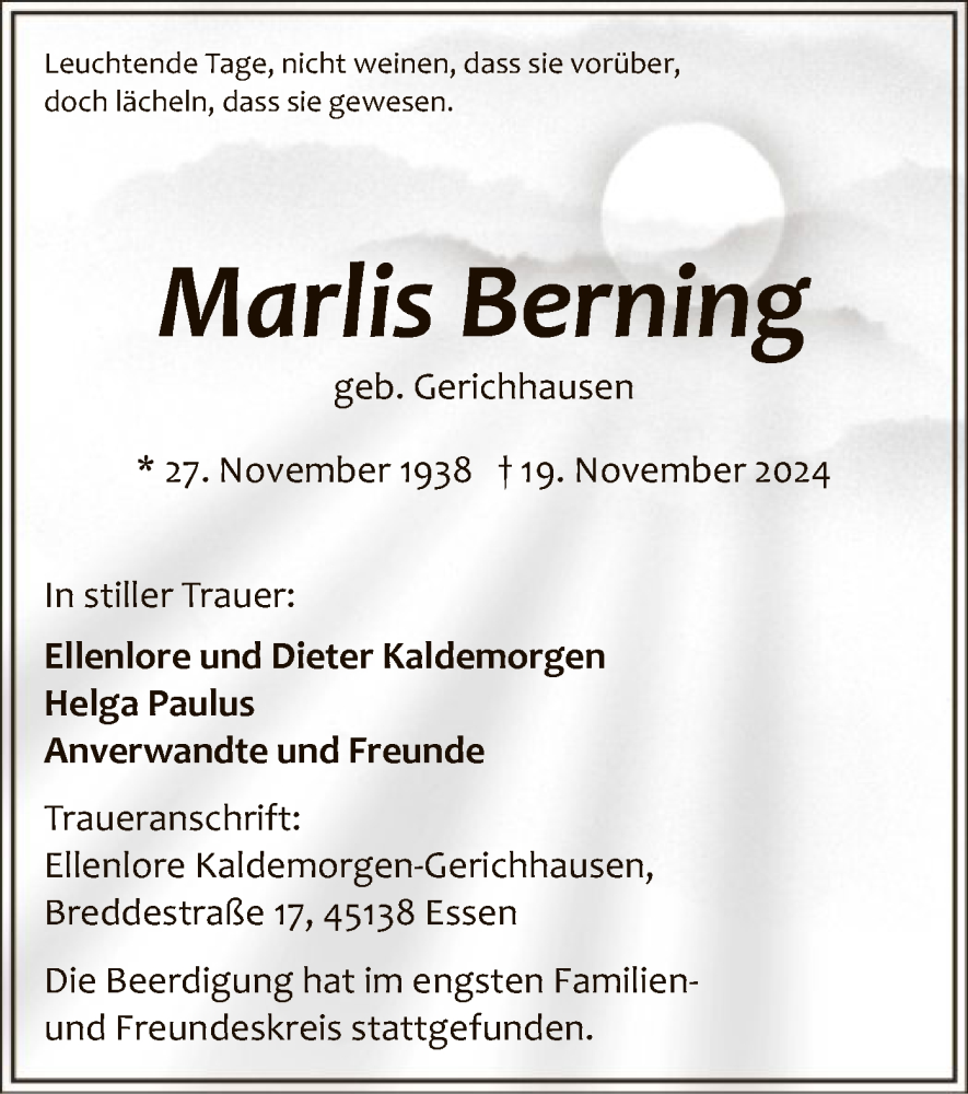 Hier finden Sie alle Traueranzeigen aus der Zeitung, die bisher für Marlis Berning erschienen sind. Weitere Traueranzeigen, die in der Zeitung erscheinen, werden hier ebenfalls aufgelistet