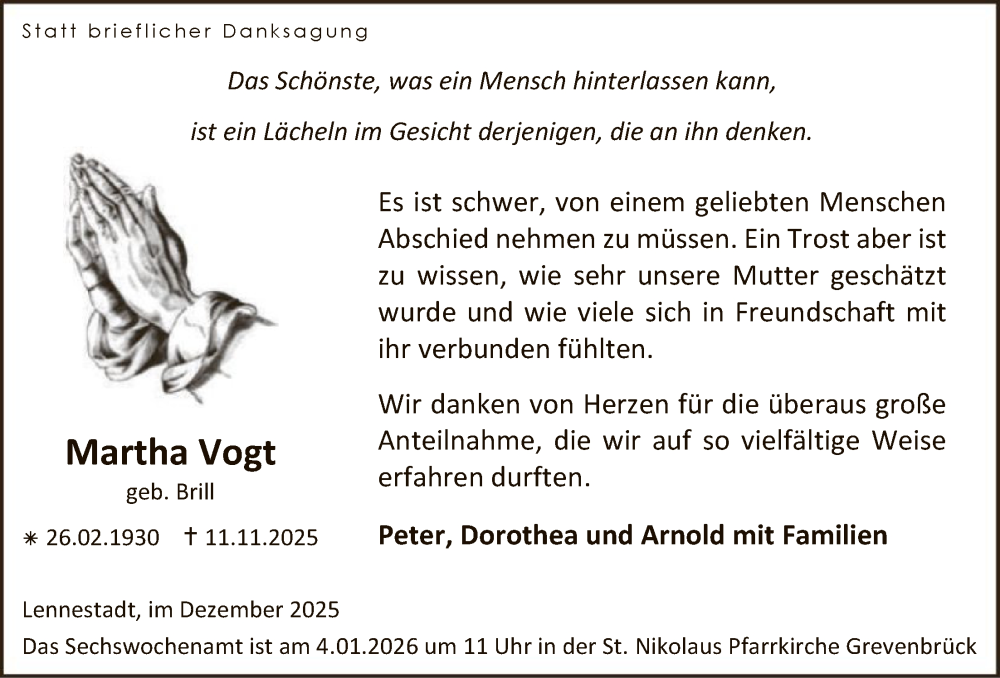 Hier finden Sie alle Traueranzeigen aus der Zeitung, die bisher für Martha Vogt erschienen sind. Weitere Traueranzeigen, die in der Zeitung erscheinen, werden hier ebenfalls aufgelistet