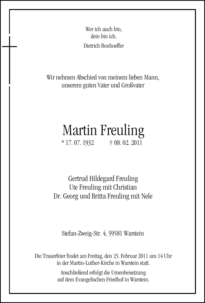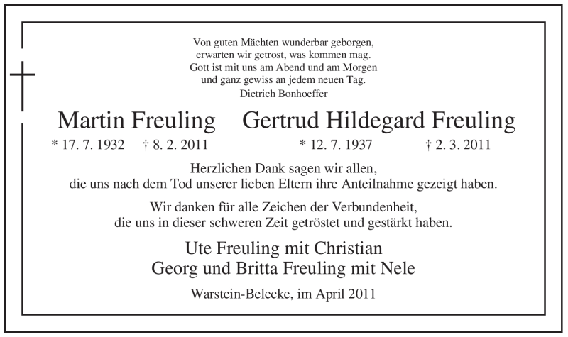 Hier finden Sie alle Traueranzeigen aus der Zeitung, die bisher für Martin Freuling erschienen sind. Weitere Traueranzeigen, die in der Zeitung erscheinen, werden hier ebenfalls aufgelistet