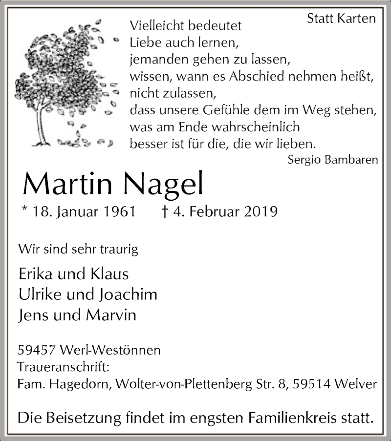 Hier finden Sie alle Traueranzeigen aus der Zeitung, die bisher für Martin Nagel erschienen sind. Weitere Traueranzeigen, die in der Zeitung erscheinen, werden hier ebenfalls aufgelistet