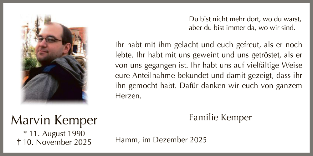 Hier finden Sie alle Traueranzeigen aus der Zeitung, die bisher für Marvin Kemper erschienen sind. Weitere Traueranzeigen, die in der Zeitung erscheinen, werden hier ebenfalls aufgelistet