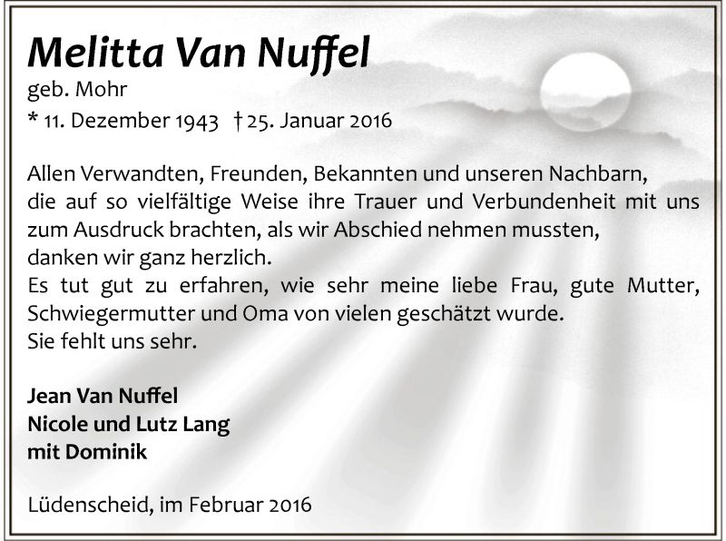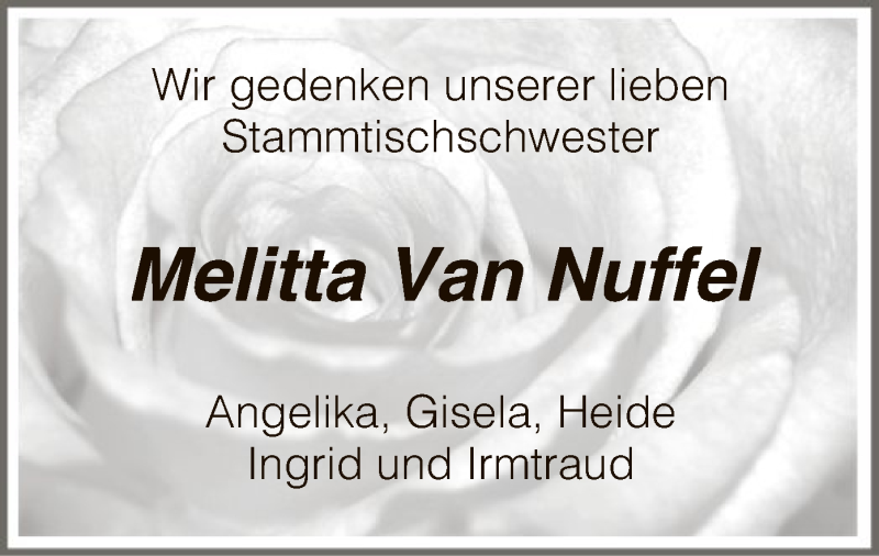 Hier finden Sie alle Traueranzeigen aus der Zeitung, die bisher für Melitta van Nuffel erschienen sind. Weitere Traueranzeigen, die in der Zeitung erscheinen, werden hier ebenfalls aufgelistet