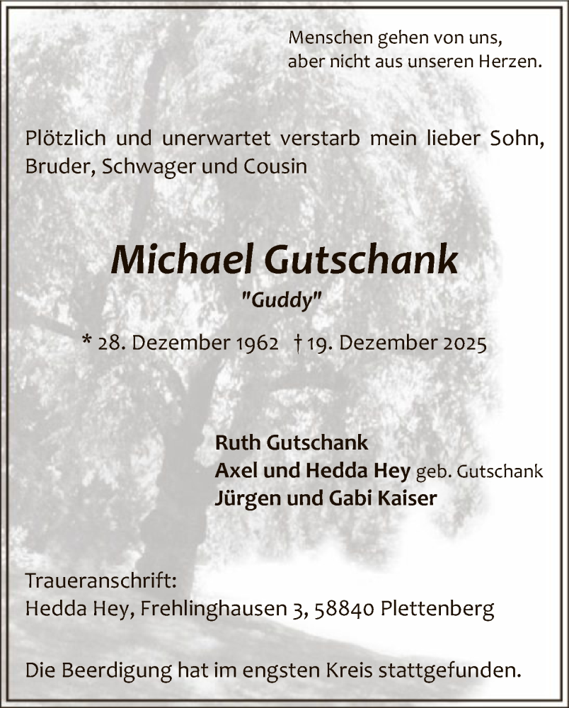 Hier finden Sie alle Traueranzeigen aus der Zeitung, die bisher für Michael Gutschank erschienen sind. Weitere Traueranzeigen, die in der Zeitung erscheinen, werden hier ebenfalls aufgelistet