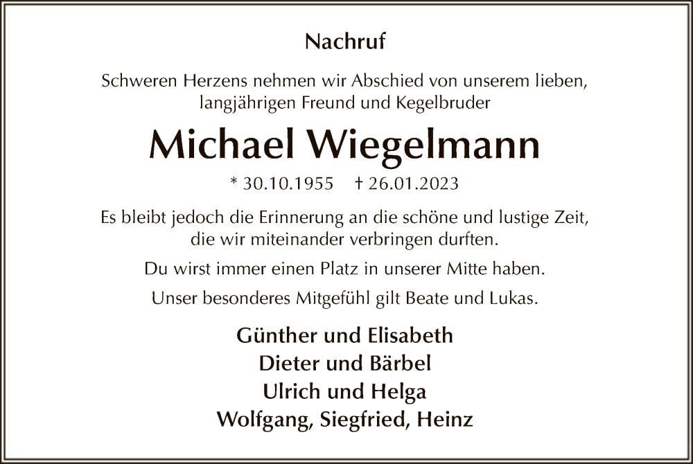 Hier finden Sie alle Traueranzeigen aus der Zeitung, die bisher für Michael Wiegelmann erschienen sind. Weitere Traueranzeigen, die in der Zeitung erscheinen, werden hier ebenfalls aufgelistet