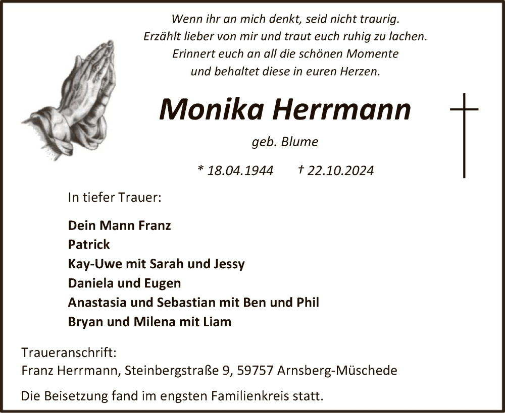 Hier finden Sie alle Traueranzeigen aus der Zeitung, die bisher für Monika Herrmann erschienen sind. Weitere Traueranzeigen, die in der Zeitung erscheinen, werden hier ebenfalls aufgelistet