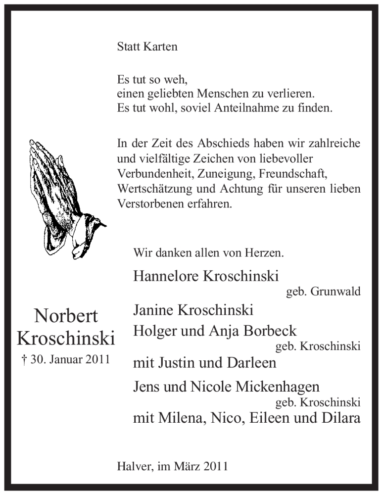 Hier finden Sie alle Traueranzeigen aus der Zeitung, die bisher für Norbert Kroschinski erschienen sind. Weitere Traueranzeigen, die in der Zeitung erscheinen, werden hier ebenfalls aufgelistet