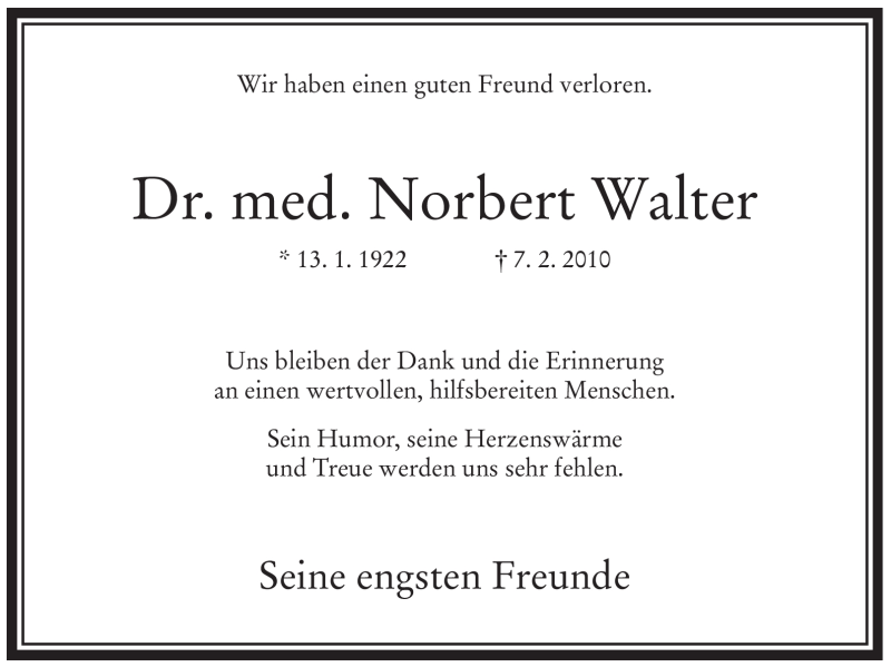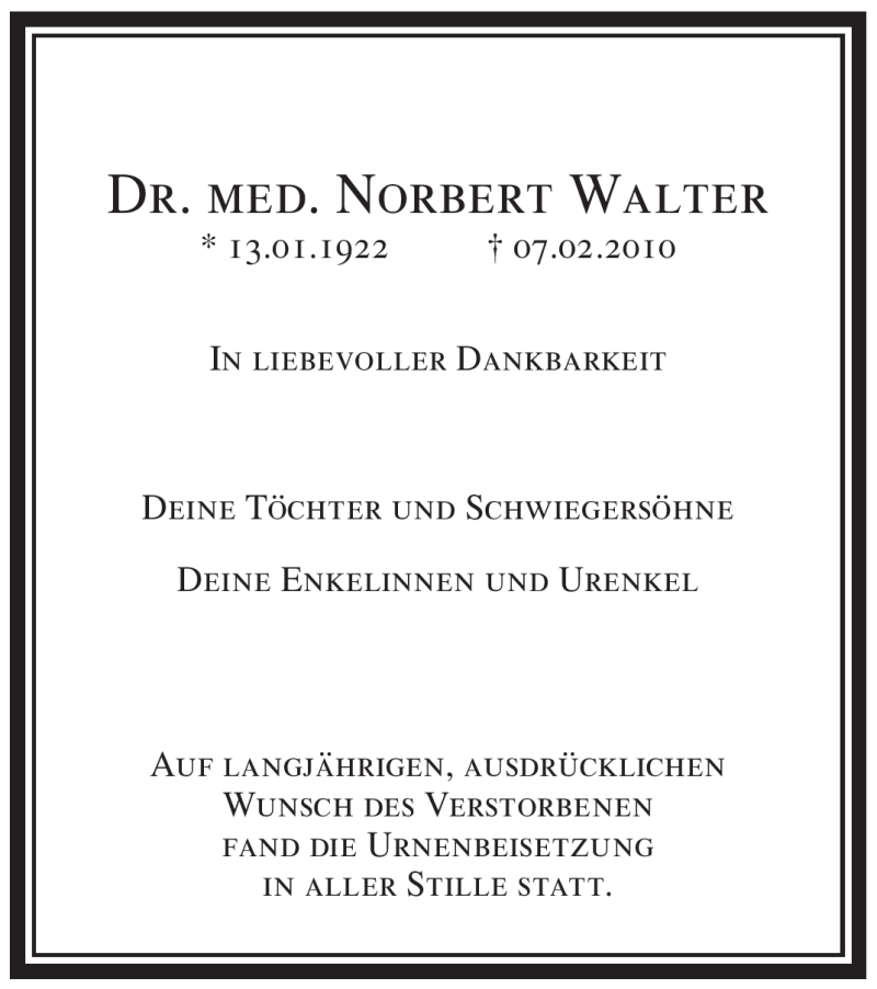 Hier finden Sie alle Traueranzeigen aus der Zeitung, die bisher für Norbert Walter erschienen sind. Weitere Traueranzeigen, die in der Zeitung erscheinen, werden hier ebenfalls aufgelistet