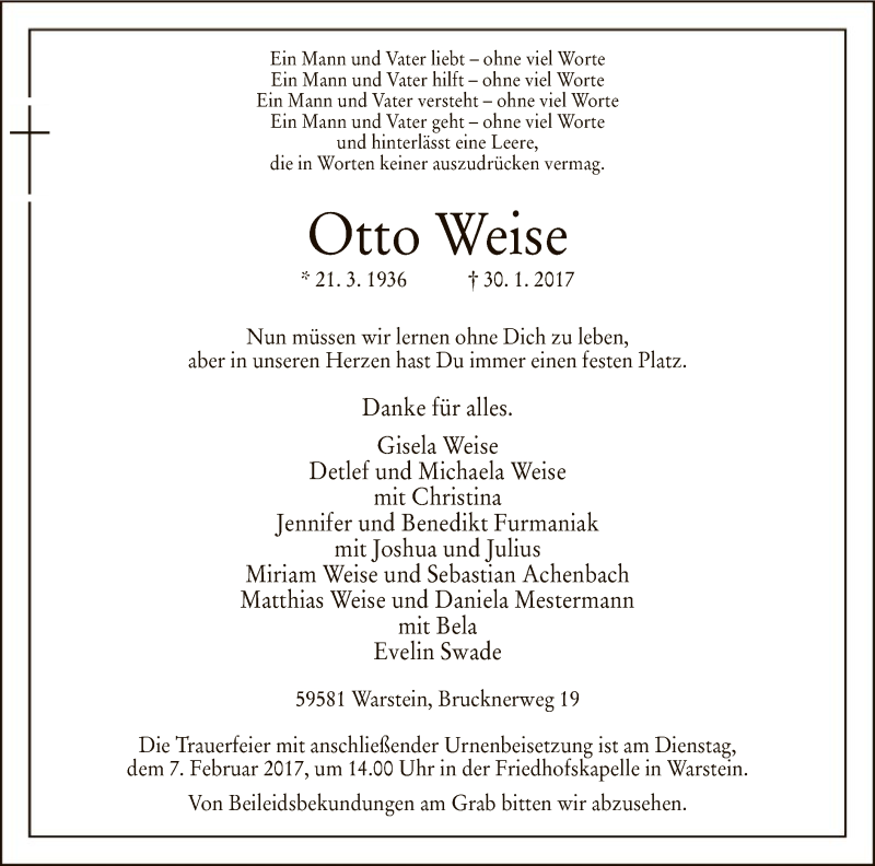 Hier finden Sie alle Traueranzeigen aus der Zeitung, die bisher für Otto Weise erschienen sind. Weitere Traueranzeigen, die in der Zeitung erscheinen, werden hier ebenfalls aufgelistet
