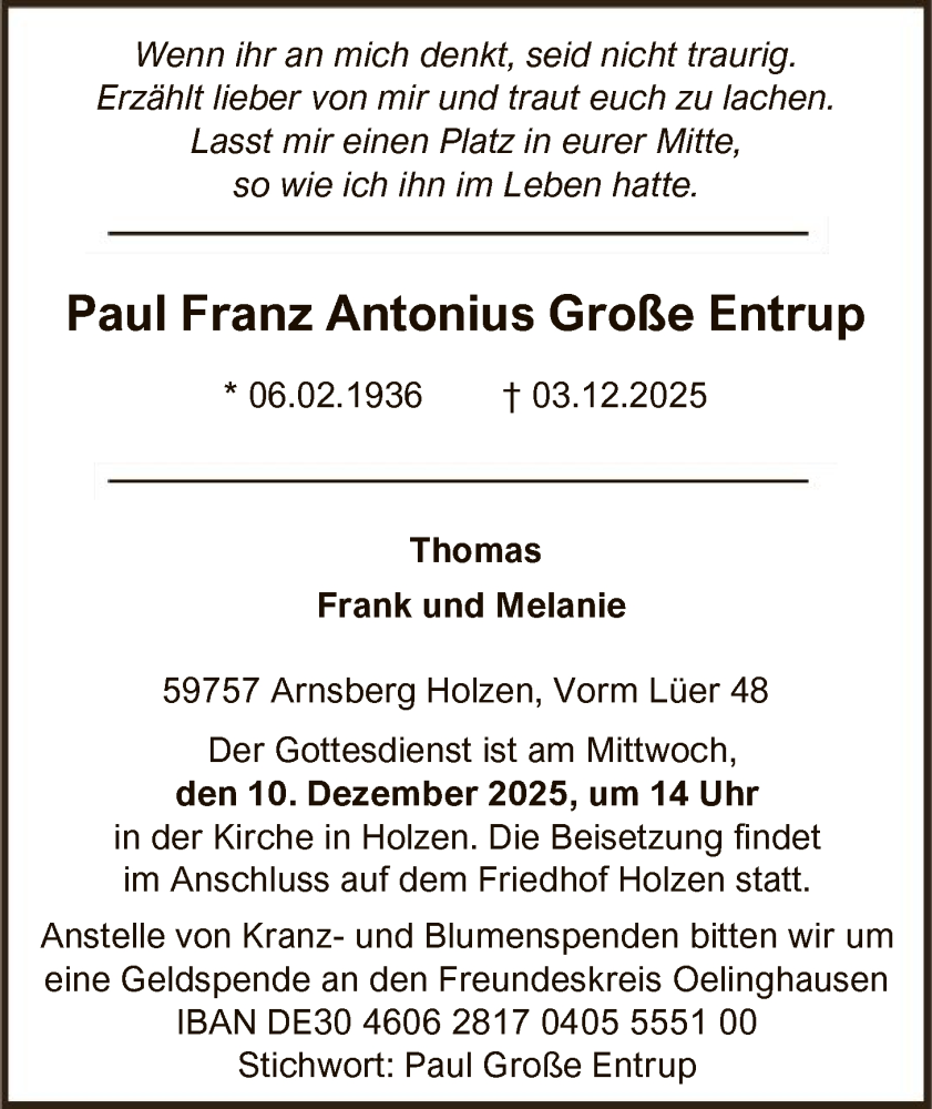 Hier finden Sie alle Traueranzeigen aus der Zeitung, die bisher für Paul Franz Antonius Große Entrup erschienen sind. Weitere Traueranzeigen, die in der Zeitung erscheinen, werden hier ebenfalls aufgelistet